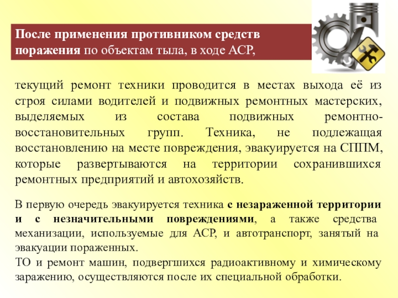 Организация эвакуации и текущего ремонта техники вышедшей из строя в ходе выполнения задач.