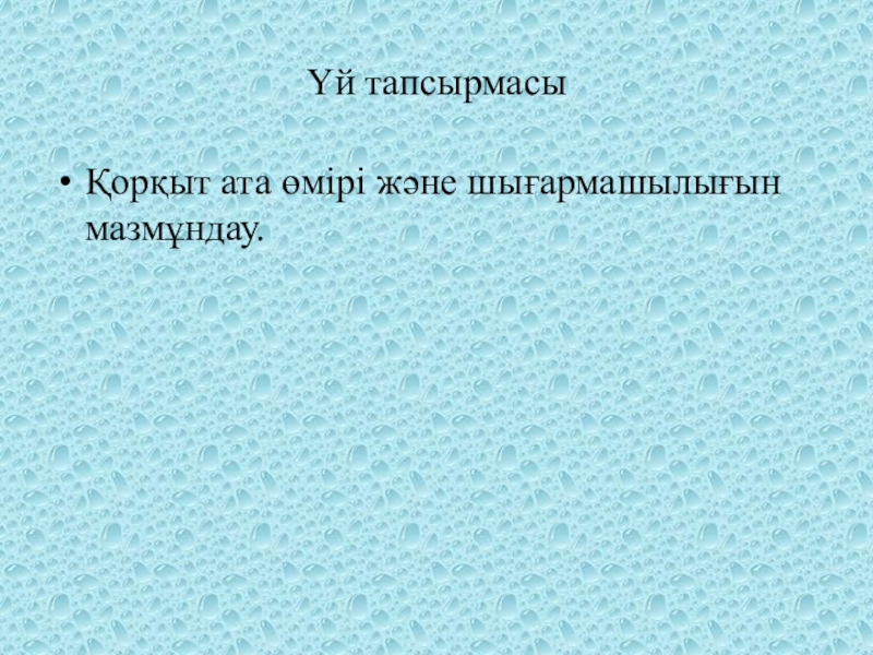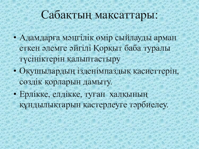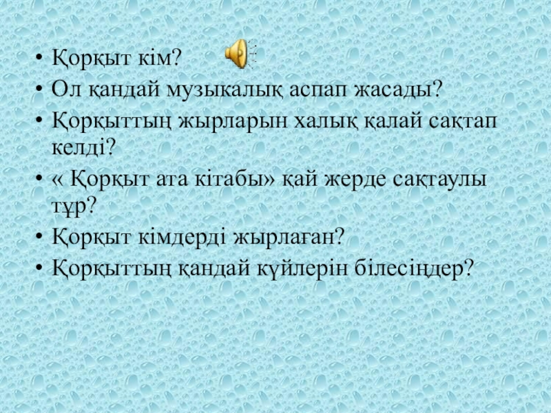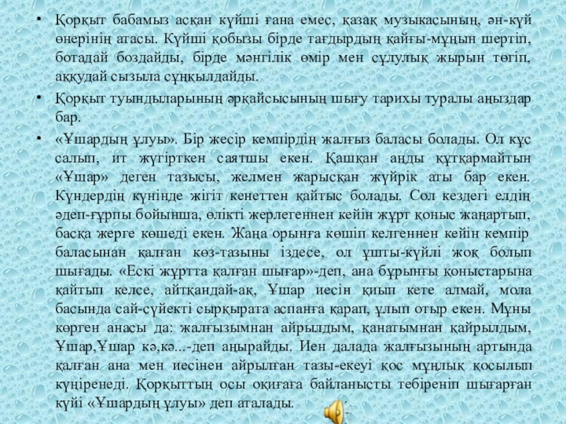 Мәңгі өлмеудің жолын қиялмен іздестіреді. Аңыз бойынша, ол ақ түйеге мініп, дүниенің төрт бұрышын кезеді. Бірақ қайда барса да, алдынан қазылып жатқан көр кездеседі. «Кімге қазып жатсыңдар?» - деген сұрауына «Қорқыттың көрі» деген жауап алады. Содан, өлімнен қашып құтылуға болмайды екен деген қорытындыға келеді. Ол пікірді оған түрлі жан-жануарлар да, өсімдіктер де, бүкіл әлем ұқтырган көрінеді. Қорқыт ата поэма, күйлер шығарып, оны қобызбен орындайтын болады.