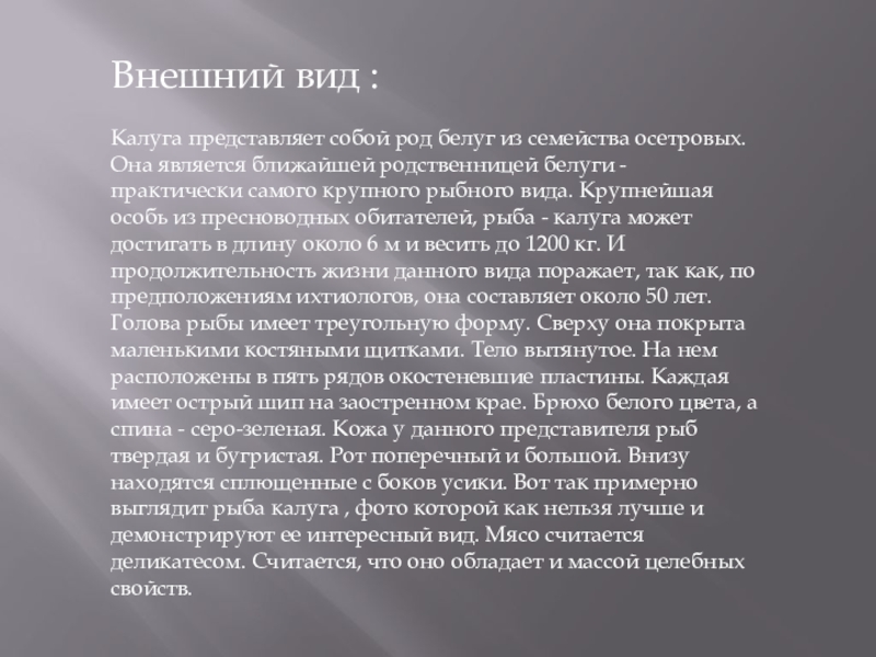 Голова рыбы имеет треугольную форму. Сверху она покрыта маленькими костяными щитками. Тело вытянутое. На нем расположены в пять рядов окостеневшие пластины. Каждая имеет острый шип на заостренном крае. Брюхо белого цвета, а спина - серо-зеленая. Кожа у данного представителя рыб твердая и бугристая. Рот поперечный и большой. Внизу находятся сплющенные с боков усики. Вот так примерно выглядит рыба калуга , фото которой как нельзя лучше и демонстрируют ее интересный вид. Мясо считается деликатесом. Считается, что оно обладает и массой целебных свойств.