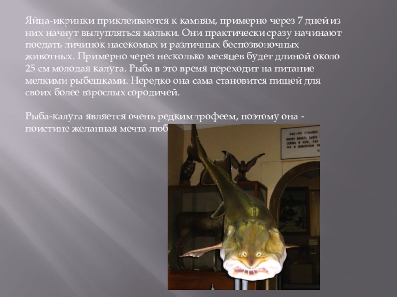 вылупляться мальки. Они практически сразу начинают поедать личинок насекомых и различных беспозвоночных животных. Примерно через несколько месяцев будет длиной около 25 см молодая калуга. Рыба в это время переходит на питание мелкими рыбешками. Нередко она сама становится пищей для своих более взрослых сородичей.