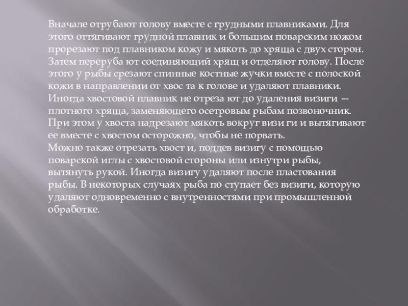 плавник и большим поварским ножом прорезают под плавником кожу и мякоть до хряща с двух сторон. Затем переруба ют соединяющий хрящ и отделяют голову. После этого у рыбы срезают спинные костные жучки вместе с полоской кожи в направлении от хвос та к голове и удаляют плавники. Иногда хвостовой плавник не отреза ют до удаления визиги — плотного хряща, заменяющего осетровым рыбам позвоночник. При этом у хвоста надрезают мякоть вокруг визи ги и вытягивают ее вместе с хвостом осторожно, чтобы не порвать.