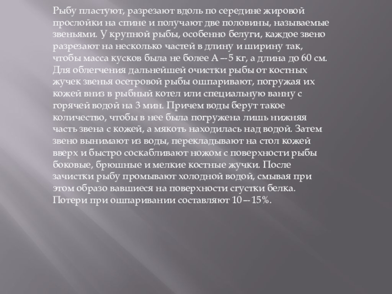 получают две половины, называемые звеньями. У крупной рыбы, особенно белуги, каждое звено разрезают на несколько частей в длину и ширину так, чтобы масса кусков была не более А—5 кг, а длина до 60 см. Для облегчения дальнейшей очистки рыбы от костных жучек звенья осетровой рыбы ошпаривают, погружая их кожей вниз в рыбный котел или специальную ванну с горячей водой на 3 мин. Причем воды берут такое количество, чтобы в нее была погружена лишь нижняя часть звена с кожей, а мякоть находилась над водой. Затем звено вынимают из воды, перекладывают на стол кожей вверх и быстро соскабливают ножом с поверхности рыбы боковые, брюшные и мелкие костные жучки. После зачистки рыбу промывают холодной водой, смывая при этом образо вавшиеся на поверхности сгустки белка. Потери при ошпаривании составляют 10—15%.
