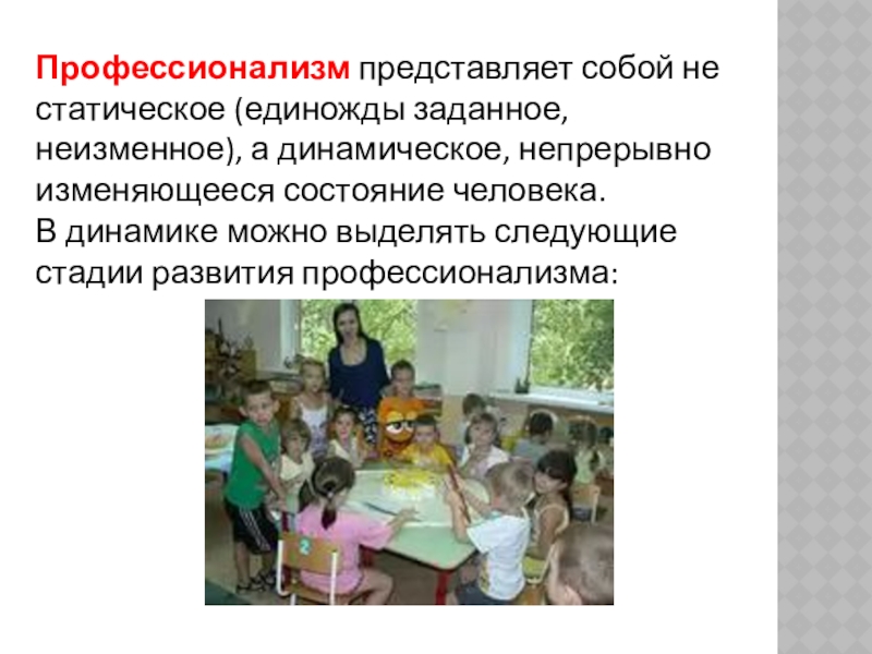 Слайд 14Профессионализм представляет собой не статическое (единожды заданное, неизменное), а динамическое, непрерывно