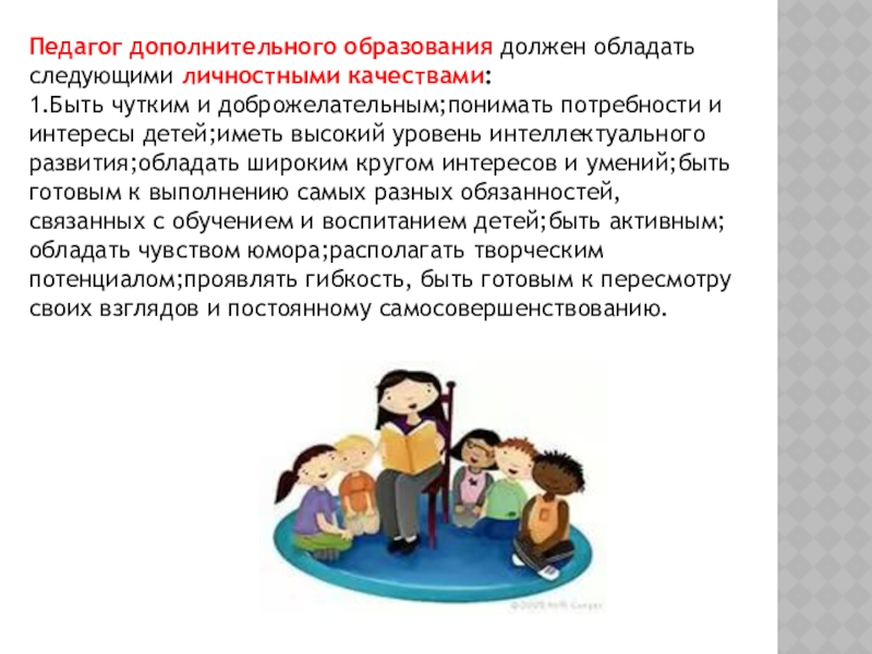 Слайд 6Педагог дополнительного образования должен обладать следующими личностными качествами: