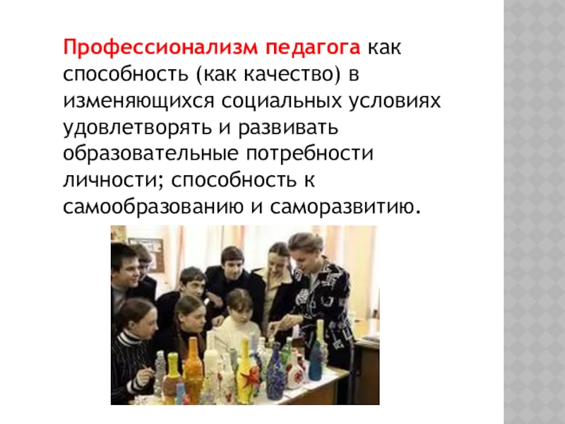 Слайд 10Профессионализм педагога как способность (как качество) в изменяющихся социальных условиях удовлетворять