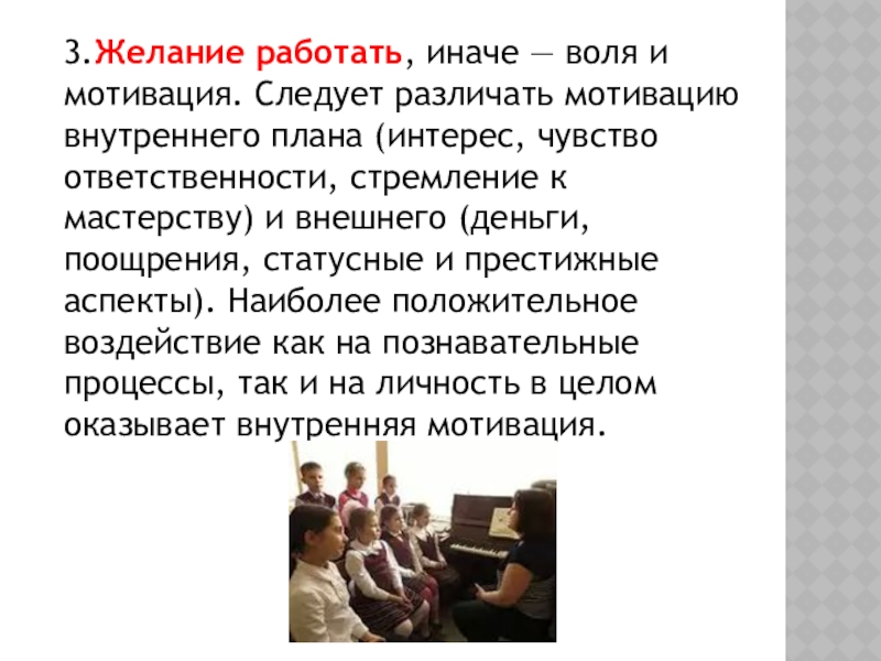 Слайд 83.Желание работать, иначе — воля и мотивация. Следует различать мотивацию внутреннего