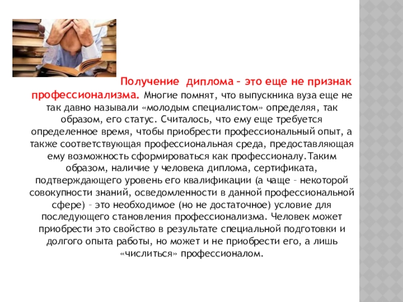Получение диплома – это еще не признак профессионализма. Многие помнят, что выпускника вуза еще не так давно называли «молодым специалистом» определяя, так образом, его статус. Считалось, что ему еще требуется определенное время, чтобы приобрести профессиональный опыт, а также соответствующая профессиональная среда, предоставляющая ему возможность сформироваться как профессионалу.Таким образом, наличие у человека диплома, сертификата, подтверждающего уровень его квалификации (а чаще – некоторой совокупности знаний, осведомленности в данной профессиональной сфере) – это необходимое (но не достаточное) условие для последующего становления профессионализма. Человек может приобрести это свойство в результате специальной подготовки и долгого опыта работы, но может и не приобрести его, а лишь «числиться» профессионалом.