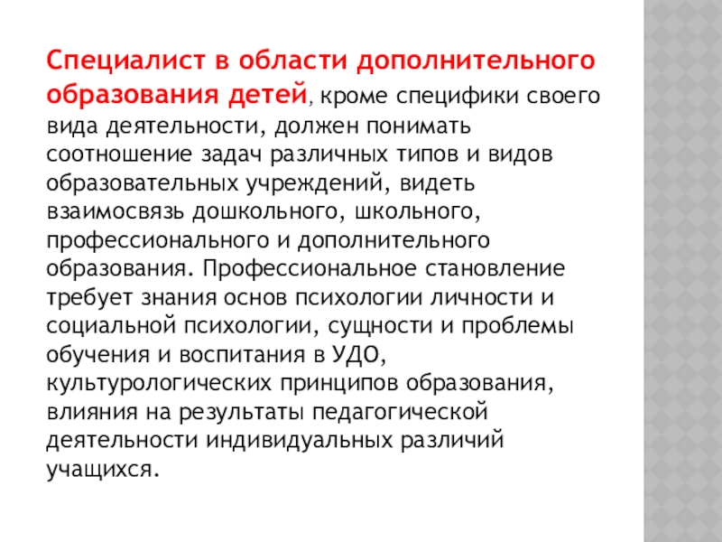 Слайд 23Специалист в области дополнительного образования детей, кроме специфики своего вида деятельности,