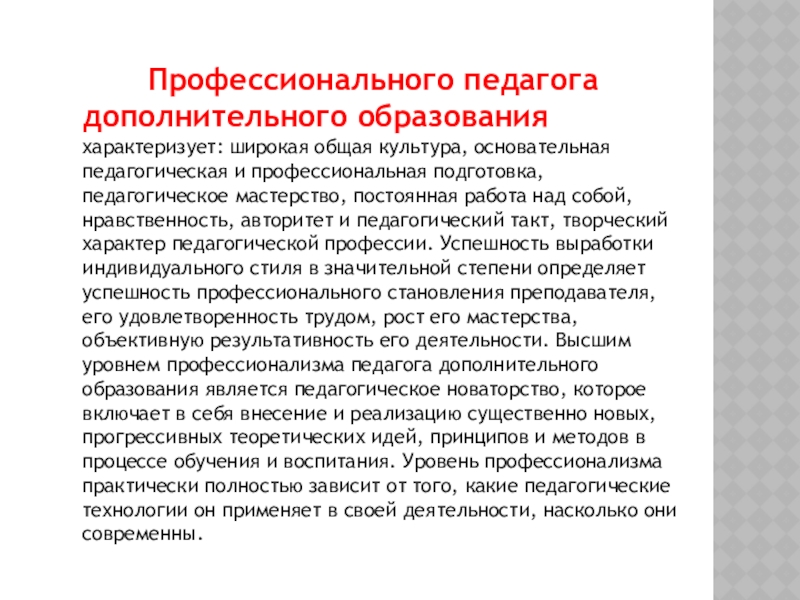 образования характеризует: широкая общая культура, основательная педагогическая и профессиональная подготовка, педагогическое мастерство, постоянная работа над собой, нравственность, авторитет и педагогический такт, творческий характер педагогической профессии. Успешность выработки индивидуального стиля в значительной степени определяет успешность профессионального становления преподавателя, его удовлетворенность трудом, рост его мастерства, объективную результативность его деятельности. Высшим уровнем профессионализма педагога дополнительного образования является педагогическое новаторство, которое включает в себя внесение и реализацию существенно новых, прогрессивных теоретических идей, принципов и методов в процессе обучения и воспитания. Уровень профессионализма практически полностью зависит от того, какие педагогические технологии он применяет в своей деятельности, насколько они современны.
