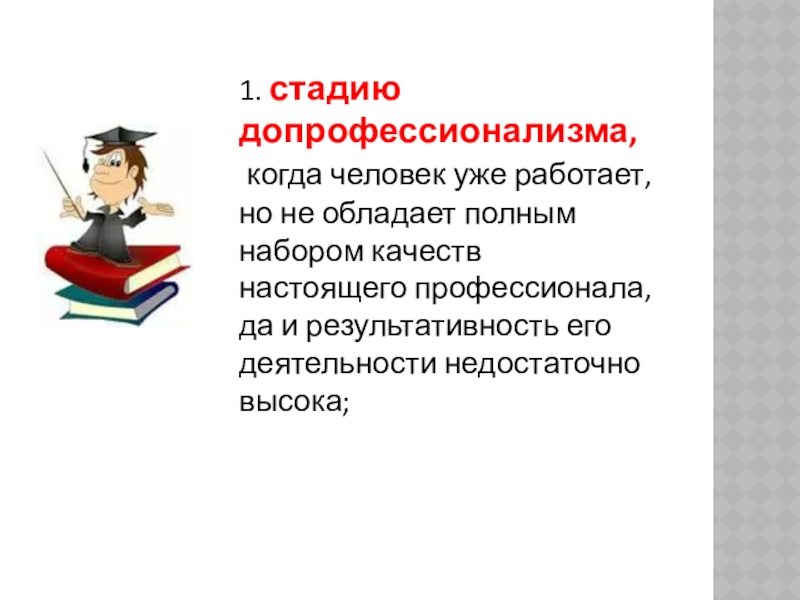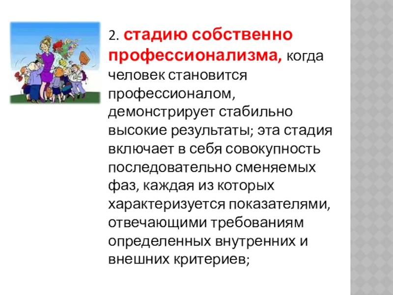Слайд 162. стадию собственно профессионализма, когда человек становится профессионалом, демонстрирует стабильно высокие