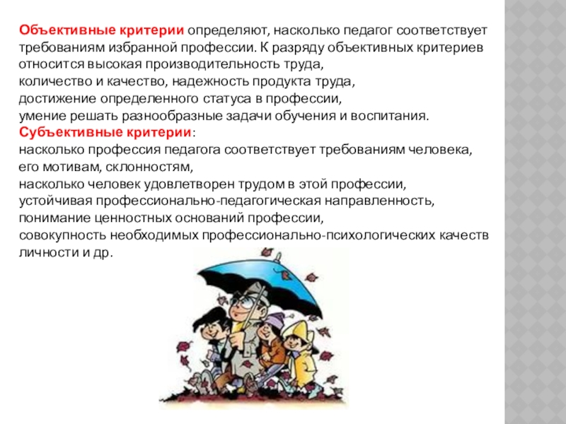 Слайд 12Объективные критерии определяют, насколько педагог соответствует требованиям избранной профессии. К разряду