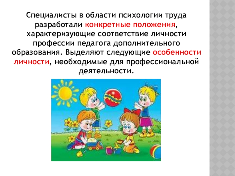Слайд 5Специалисты в области психологии труда разработали конкретные положения, характеризующие соответствие личности