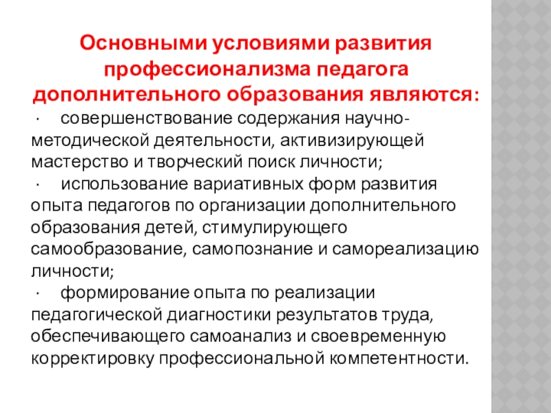 Слайд 21Основными условиями развития профессионализма педагога дополнительного образования являются: