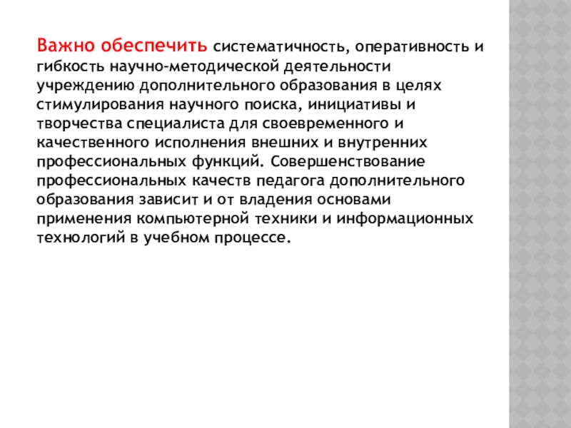 Слайд 20Важно обеспечить систематичность, оперативность и гибкость научно-методической деятельности учреждению дополнительного образования