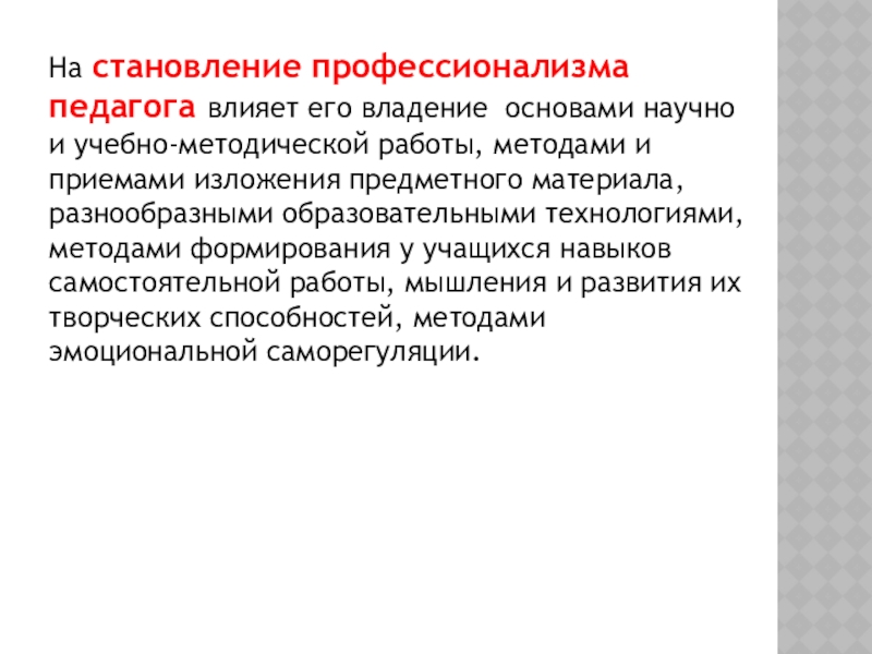 Слайд 19На становление профессионализма педагога влияет его владение основами научно и учебно-методической