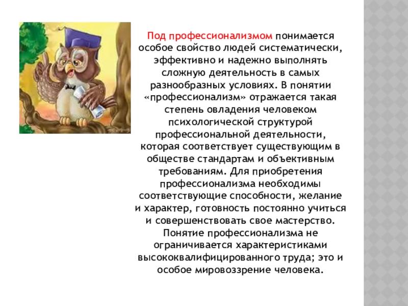 Слайд 9Под профессионализмом понимается особое свойство людей систематически, эффективно и надежно выполнять