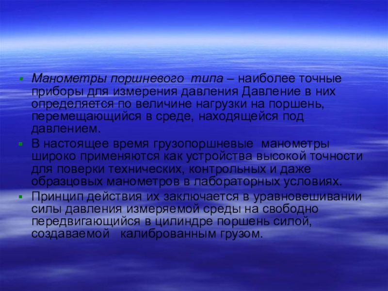 Принцип действия их заключается в уравновешивании силы давления измеряемой среды на свободно передвигающийся в цилиндре поршень силой, создаваемой калиброванным грузом.