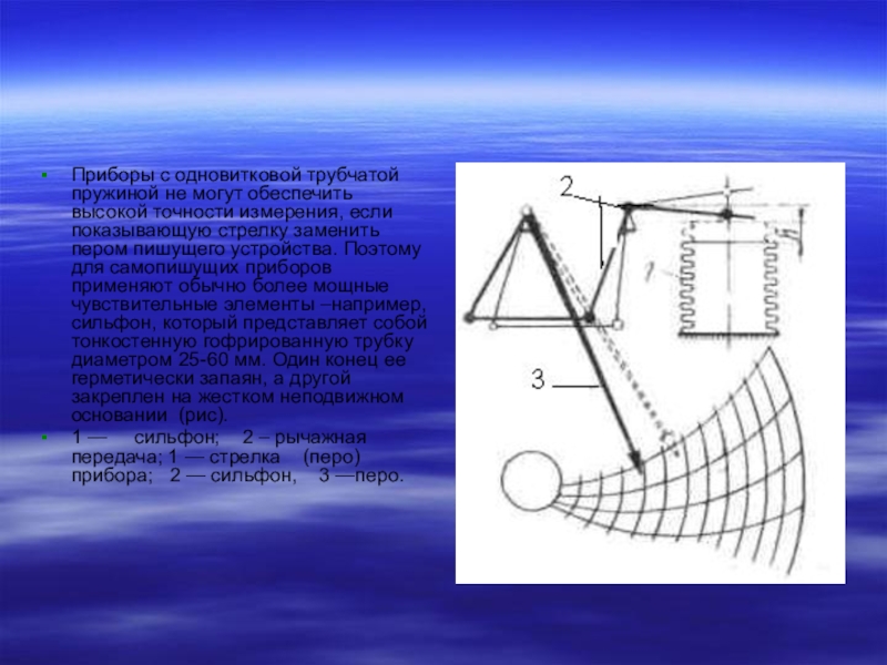 1 — сильфон; 2 – рычажная передача; 1 — стрелка (перо) прибора; 2 — сильфон, 3 —перо.