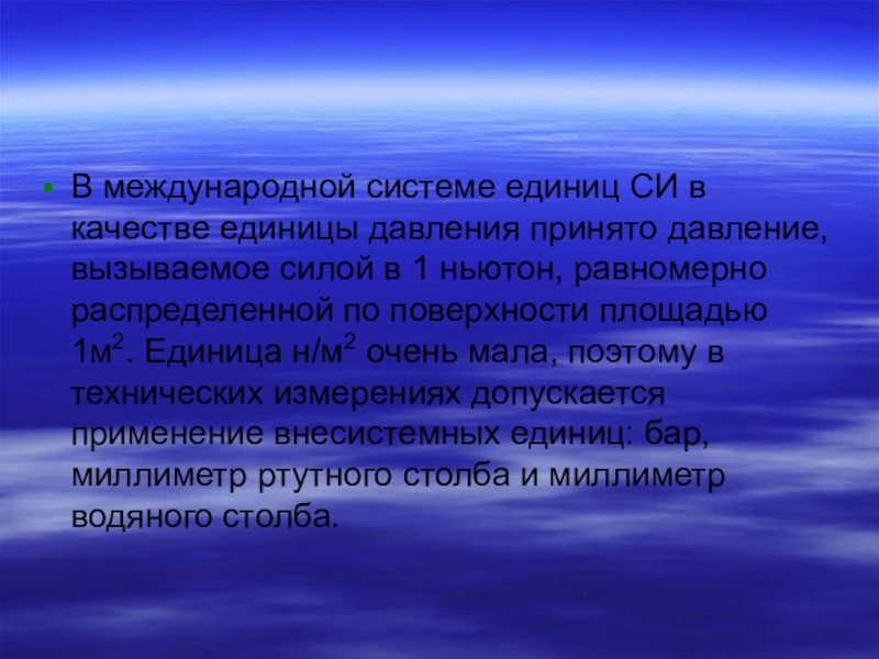 вызываемое силой в 1 ньютон, равномерно распределенной по поверхности площадью 1м2. Единица н/м2 очень мала, поэтому в технических измерениях допускается применение внесистемных единиц: бар, миллиметр ртутного столба и миллиметр водяного столба.