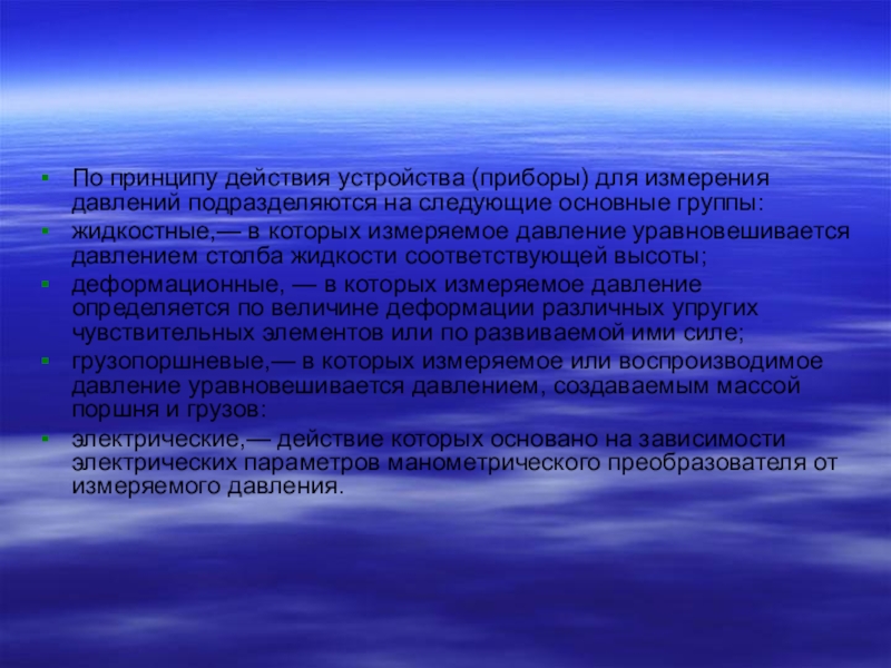По принципу действия устройства (приборы) для измерения давлений подразделяются на следующие