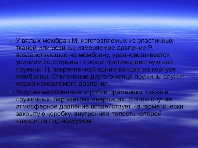 Упругие мембранные коробки применяют также в пружинных; барометрах-анероидах. В этом случае атмосферное давление воздействует на герметически закрытую коробку, внутренняя полость которой находится под вакуумом.