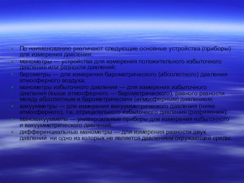 вакуумметры — для измерения вакуумметрического давления (ниже атмосферного), т.е. отрицательного избыточного давления (разряжения);
