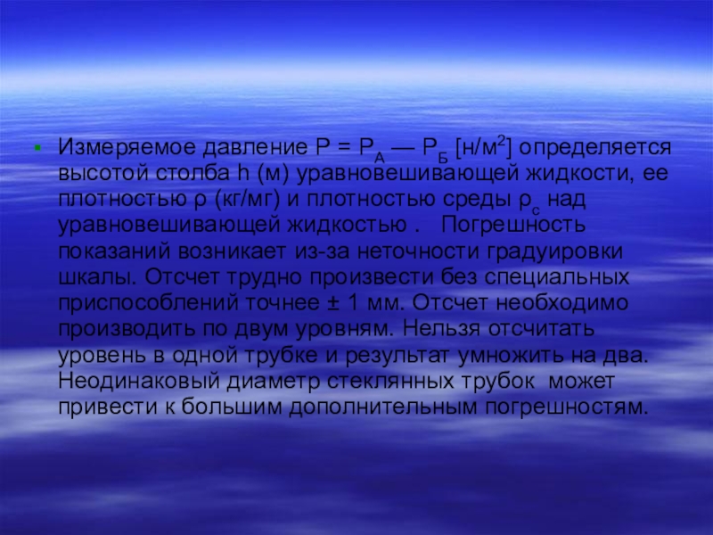 h (м) уравновешивающей жидкости, ее плотностью ρ (кг/мг) и плотностью среды ρc над уравновешивающей жидкостью . Погрешность показаний возникает из-за неточности градуировки шкалы. Отсчет трудно произвести без специальных приспособлений точнее ± 1 мм. Отсчет необходимо производить по двум уровням. Нельзя отсчитать уровень в одной трубке и результат умножить на два. Неодинаковый диаметр стеклянных трубок может привести к большим дополнительным погрешностям.