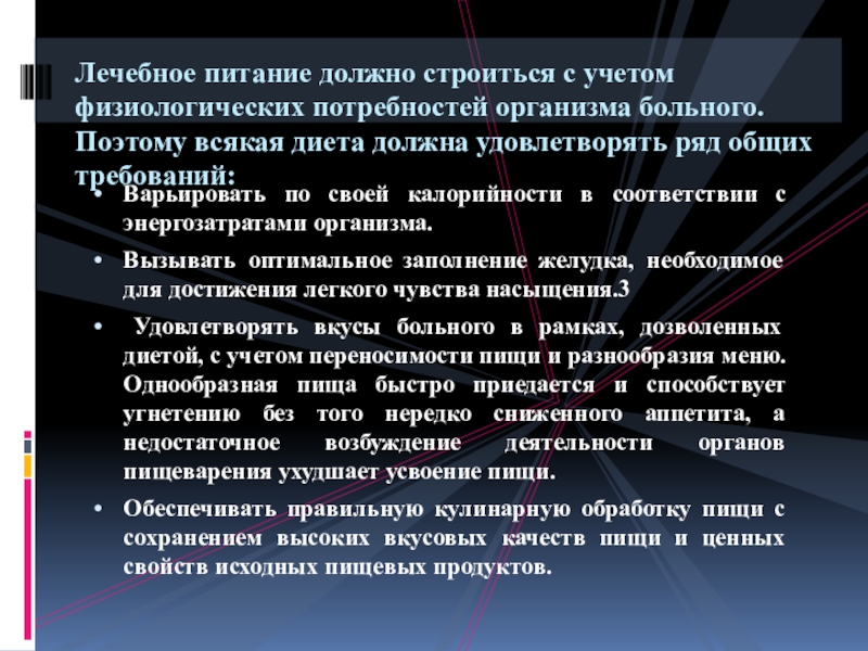 Лечебное питание должно строиться с учетом физиологических потребностей организма больного. Поэтому всякая диета должна удовлетворять ряд общих требований: