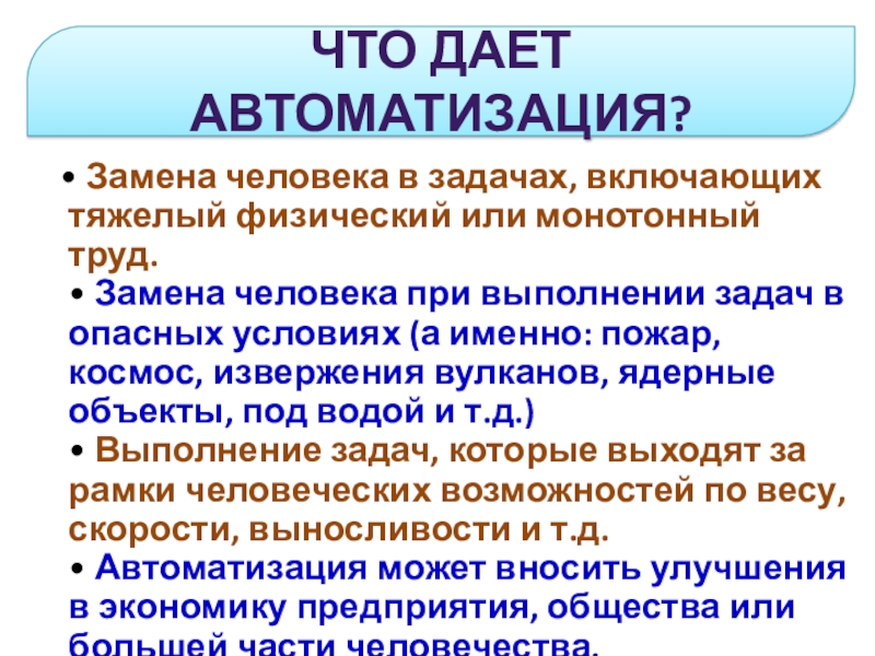 • Автоматизация может вносить улучшения в экономику предприятия, общества или большей части человечества.
