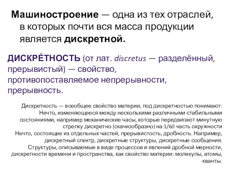 Нечто, состоящее из отдельных частей, прерывистость, дробность. Например, дискретный спектр, дискретные структуры, дискретные сообщения.