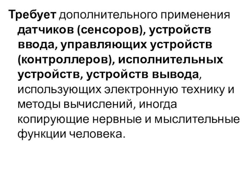 Слайд 12Требует дополнительного применения датчиков (сенсоров), устройств ввода, управляющих устройств (контроллеров), исполнительных