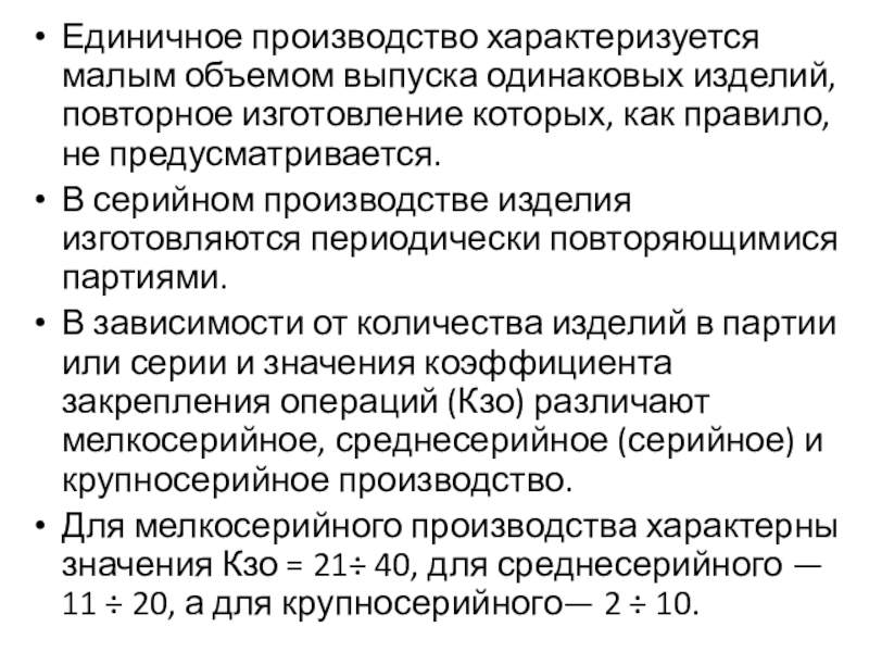 В зависимости от количества изделий в партии или серии и значения коэффициента закрепления операций (Кзо) различают мелкосерийное, среднесерийное (серийное) и крупносерийное производство.
