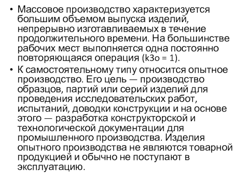 Слайд 34Массовое производство характеризуется большим объемом выпуска изделий, непрерывно изготавливаемых в течение