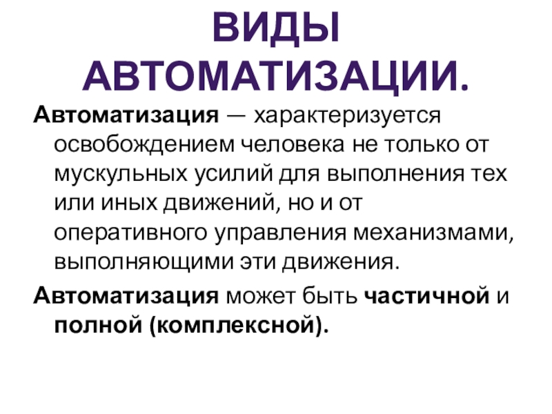 Автоматизация — характеризуется освобождением человека не только от мускульных усилий для