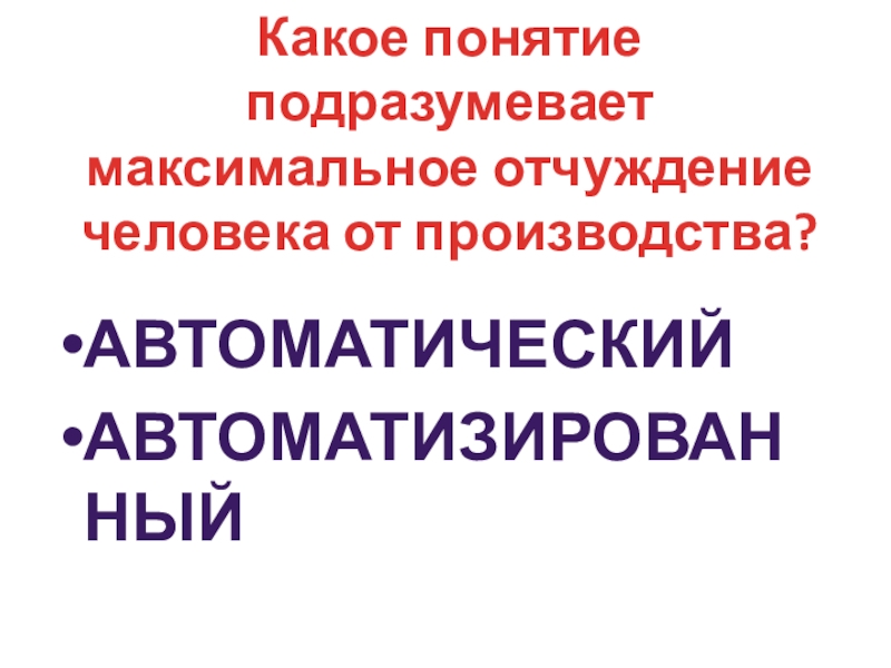Слайд 13Какое понятие подразумевает максимальное отчуждение человека от производства?