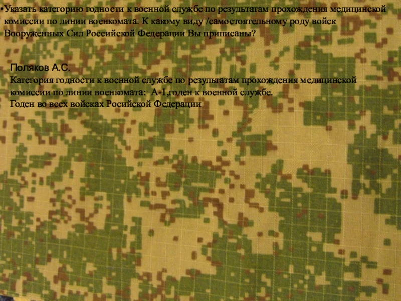 Категория годности к военной службе по результатам прохождения медицинской комиссии по линии военкомата: А-1,годен к военной службе.