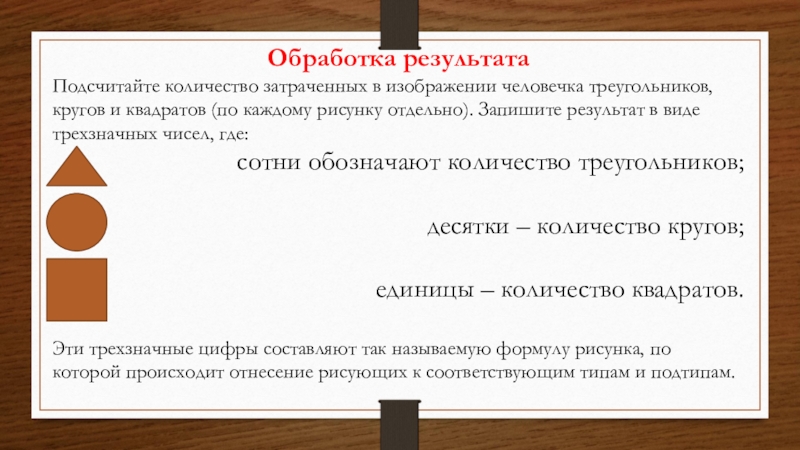 Важно, чтобы все эти три элемента в изображении человека присутствовали, а сумма общего количества использованных фигур была равна 10. Если при рисовании вы использовали большее количество фигур, то нужно зачеркнуть лишние, если же вами использовано фигур меньше чем 10, необходимо дорисовать недостающие. Таких рисунков должно быть три. Рисовать надо не задумываясь, первое, что приходит в голову, и не смотреть в предыдущие результаты.