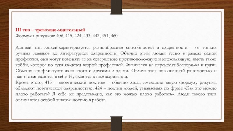 Кроме этого, 415 – «поэтический подтип» – обычно лица, имеющие такую формулу рисунка, обладают поэтической одаренностью; 424 – подтип людей, узнаваемых по фразе «Как это можно плохо работать? Я себе не представляю, как это можно плохо работать». Люди такого типа отличаются особой тщательностью в работе.