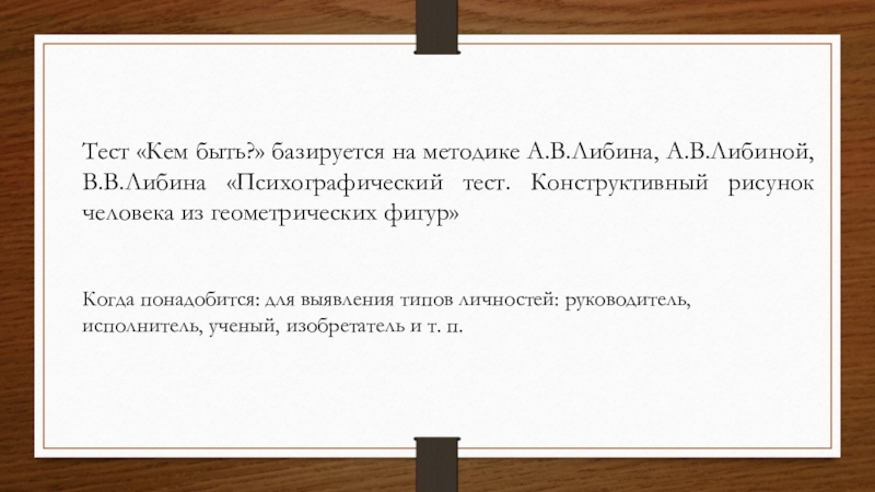 Слайд 11Тест «Кем быть?» базируется на методике А.В.Либина, А.В.Либиной, В.В.Либина «Психографический тест.