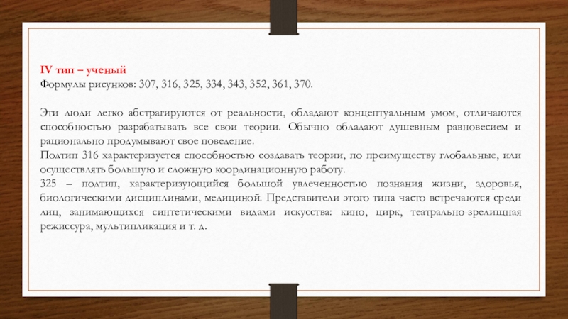 Эти люди легко абстрагируются от реальности, обладают концептуальным умом, отличаются способностью разрабатывать все свои теории. Обычно обладают душевным равновесием и рационально продумывают свое поведение.