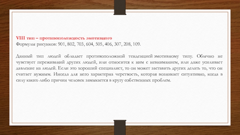 Данный тип людей обладает противоположной тенденцией эмотивному типу. Обычно не чувствует переживаний других людей, или относится к ним с невниманием, или даже усиливает давление на людей. Если это хороший специалист, то он может заставить других делать то, что он считает нужным. Иногда для него характерна черствость, которая возникает ситуативно, когда в силу каких-либо причин человек замыкается в кругу собственных проблем.