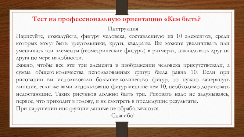 Слайд 10Тест на профессиональную ориентацию «Кем быть?