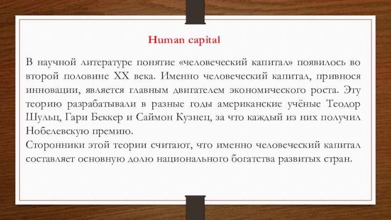 ХХ века. Именно человеческий капитал, привнося инновации, является главным двигателем экономического роста. Эту теорию разрабатывали в разные годы американские учёные Теодор Шульц, Гари Беккер и Саймон Кузнец, за что каждый из них получил Нобелевскую премию.