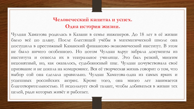 семье инженеров. До 18 лет в её жизни было всё по плану. После блестящей учёбы в математической школе она поступила в престижный Казанский финансово-экономический институт. В этом не было ничего особенного. Но потом Чулпан вдруг забрала документы из института и отнесла их в театральное училище. Это был резкий, многим непонятный, но, как оказалось, судьбоносный шаг. Чулпан почувствовала своё призвание и не пошла на компромисс. Вся её творческая жизнь говорит о том, что выбор сой она сделала правильно. Чулпан Хаматова-одна из самых ярких и успешных российских актрис. Кроме того, она много лет занимается благотворительностью. И использует свой талант, чтобы добиваться в жизни тех целей, ради которых живёт и работает.