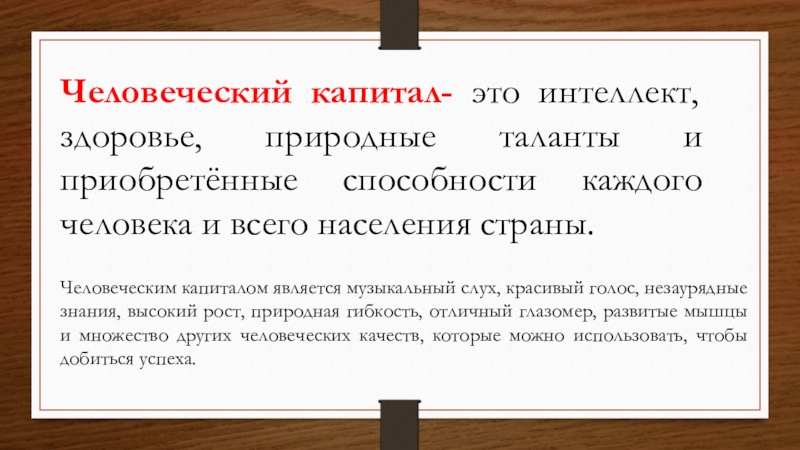 Человеческим капиталом является музыкальный слух, красивый голос, незаурядные знания, высокий рост, природная гибкость, отличный глазомер, развитые мышцы и множество других человеческих качеств, которые можно использовать, чтобы добиться успеха.