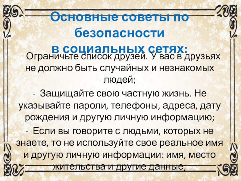 вас в друзьях не должно быть случайных и незнакомых людей;