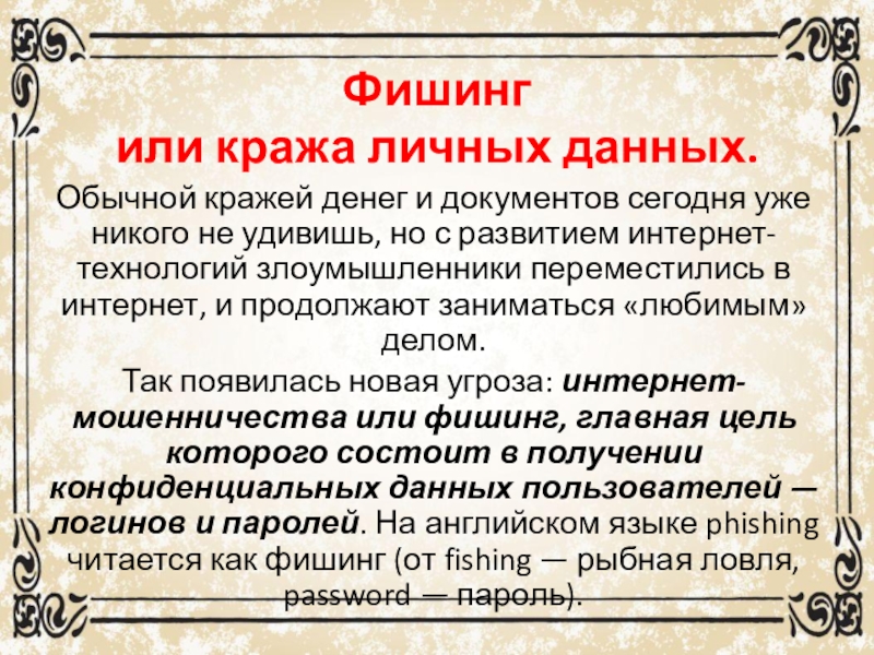 Так появилась новая угроза: интернет-мошенничества или фишинг, главная цель которого состоит в получении конфиденциальных данных пользователей — логинов и паролей. На английском языке phishing читается как фишинг (от fishing — рыбная ловля, password — пароль).