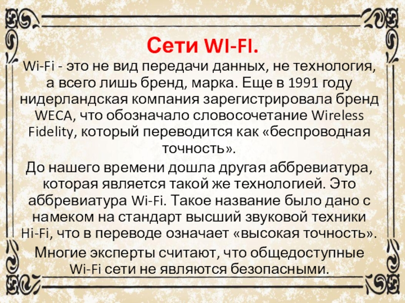 всего лишь бренд, марка. Еще в 1991 году нидерландская компания зарегистрировала бренд WECA, что обозначало словосочетание Wireless Fidelity, который переводится как «беспроводная точность».