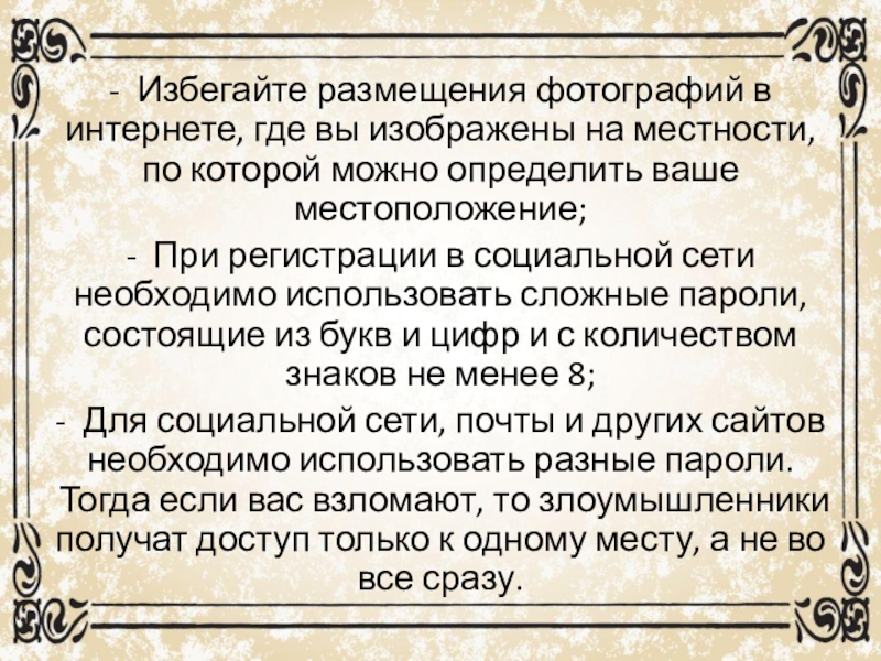 - При регистрации в социальной сети необходимо использовать сложные пароли, состоящие из букв и цифр и с количеством знаков не менее 8;