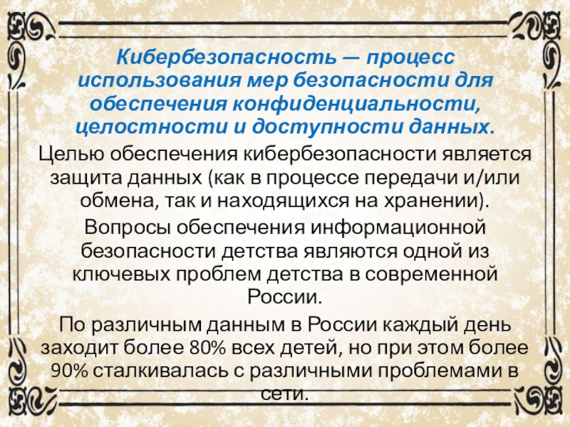 Слайд 2Кибербезопасность — процесс использования мер безопасности для обеспечения конфиденциальности, целостности и доступности